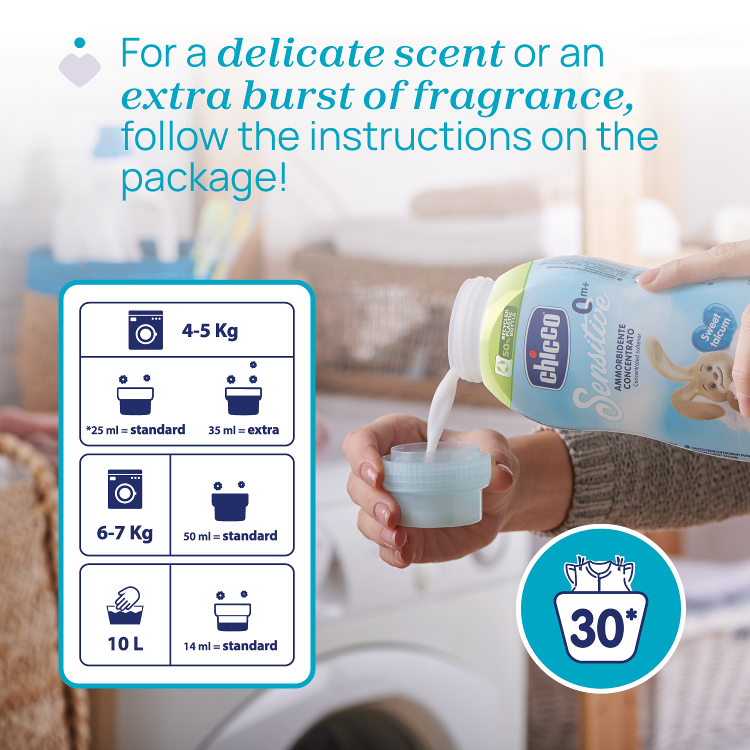 Orice articol al copilului dvs va deveni placut la atingere cu balsamul CHICCO, fara a irita pielea sensibila a acestuia. Aditivii naturali parfumeaza usor fara a deteriora culorile sau tesatura materialului.