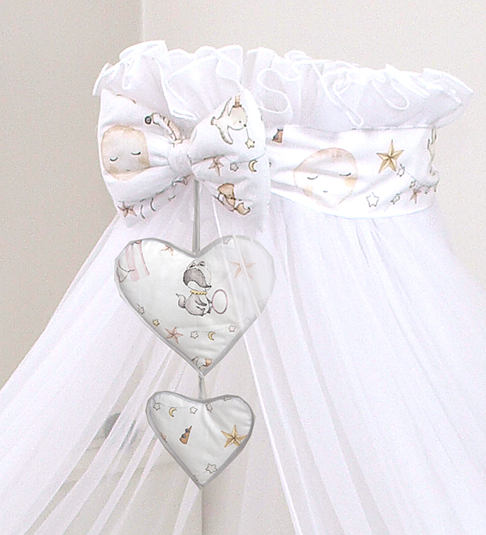 Foarte frumos impodobit in partea de sus cu inima generoasa aplicata si banda pe marginile verticale ii ofera baldachinului un aspect unic, princiar, care il face unic in randul produselor de acest tip. Poate fi pozitionat atat pe capatul de pat cat si pe laterala patului.