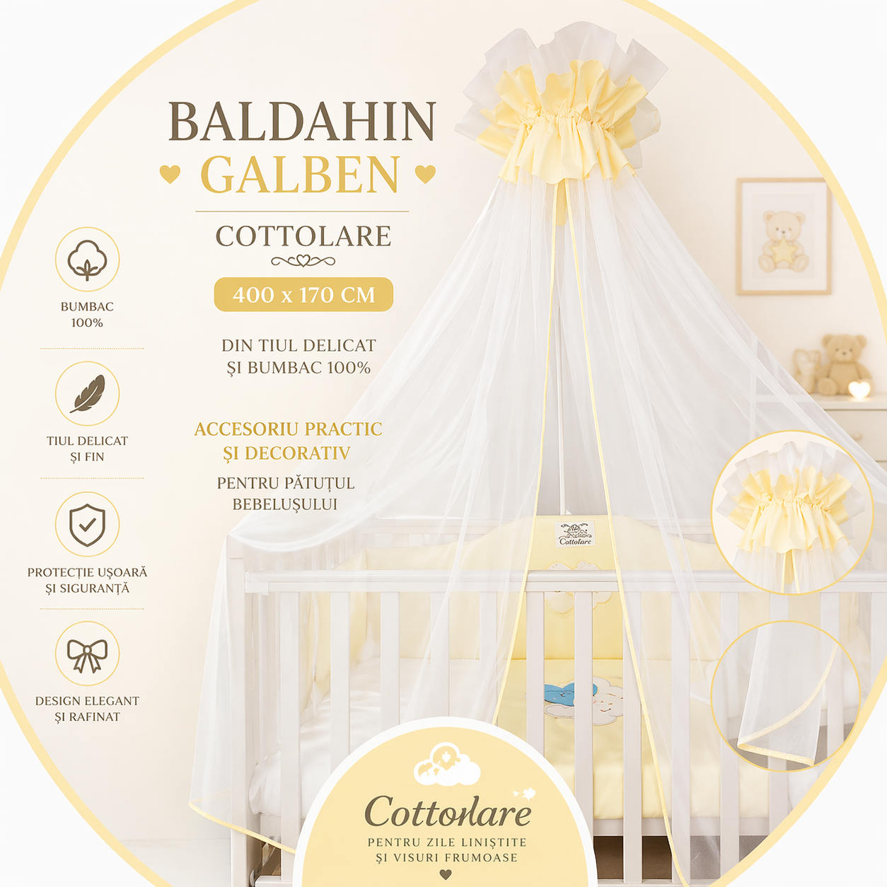 Baldachin galben – Cottolare 400×170 cm, din tiul delicat și bumbac 100% – un accesoriu practic și decorativ pentru pătuțul bebelușului.