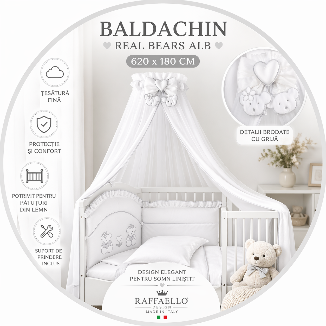 Raffaello Design Made in Italy Baldachin patut lemn cu suport de prindere inclus Real Bears Alb, 620x180 cm