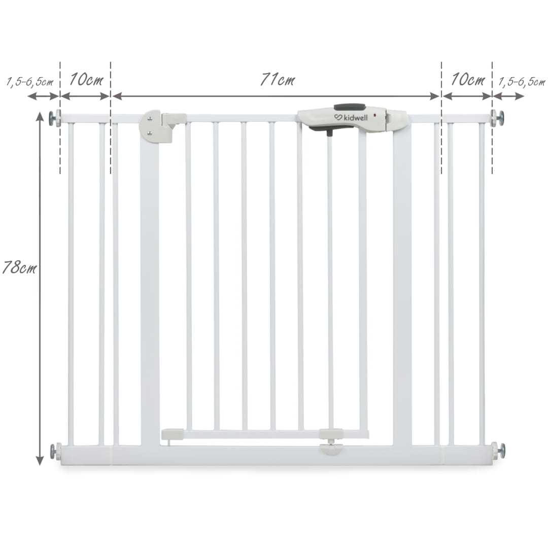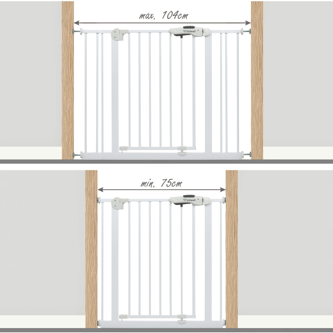 Kidwell Guarda – poartă de siguranță reglabilă 75–104 cm, cu închidere automată și blocaj dublu. Montaj ușor, fără găurire, ideală pentru uși și scări.