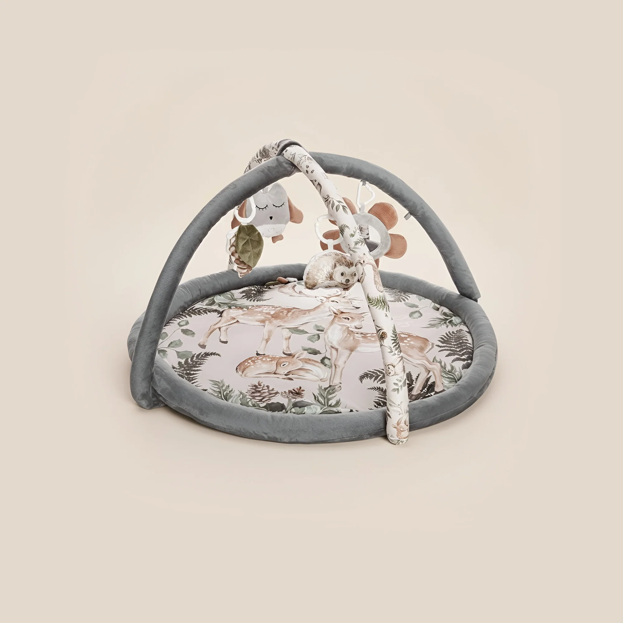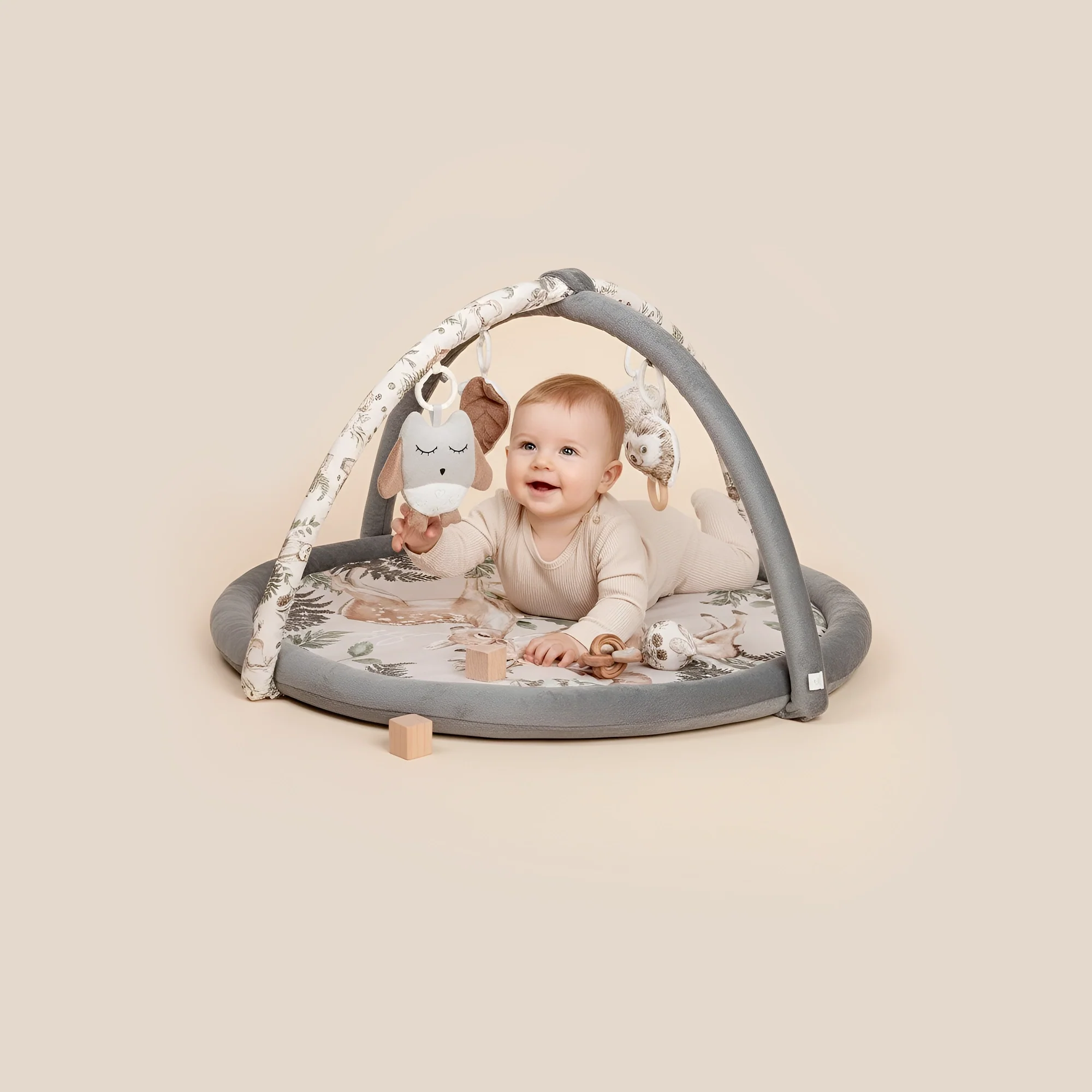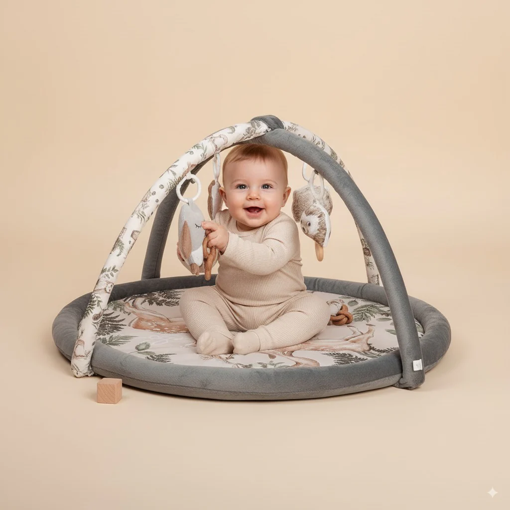 Prin joc, susține dezvoltarea simțurilor – vedere, auz și atingere. În același timp, susține creșterea abilităților manuale și motorii, încurajând copilul să facă mișcare și să prindă jucării agățate.