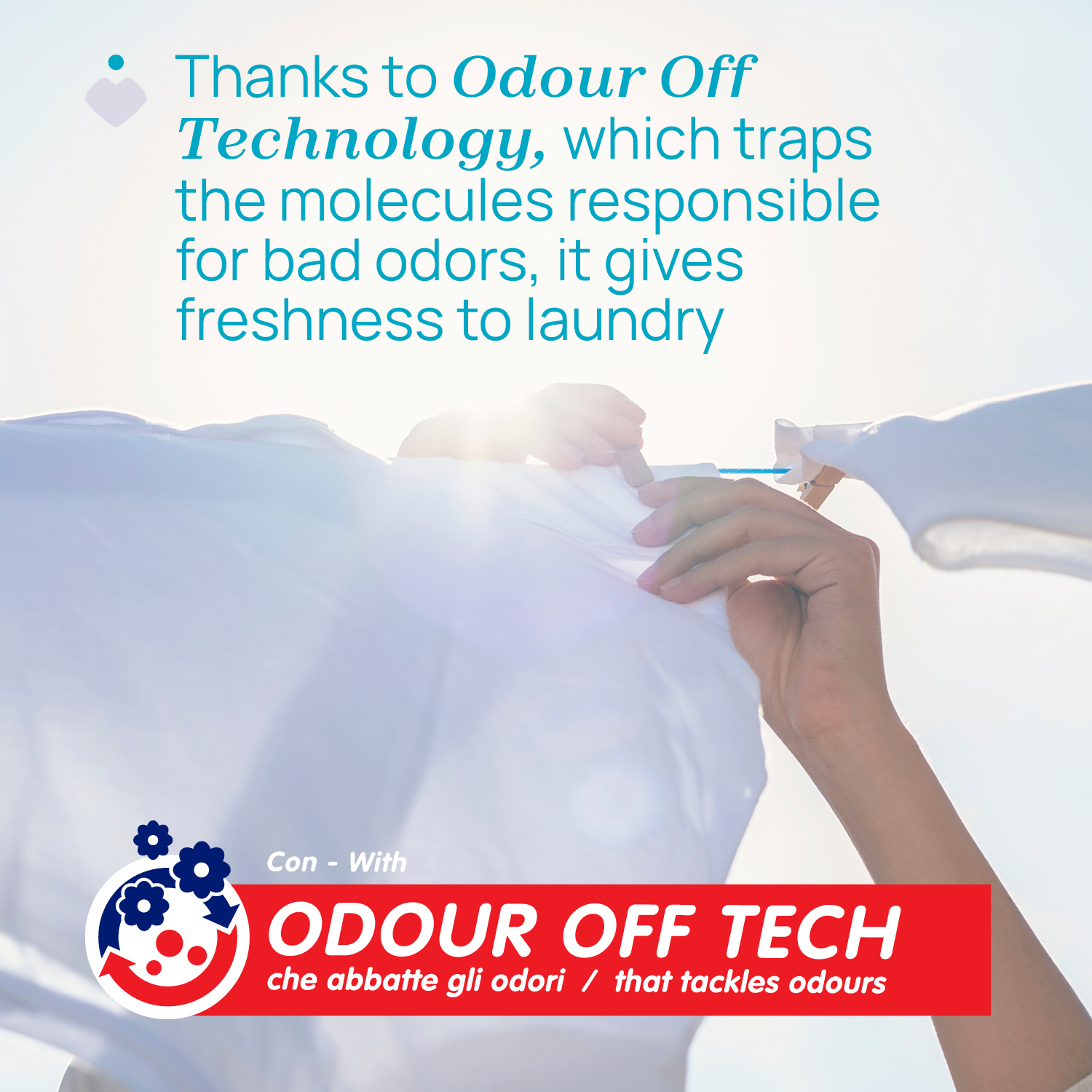 - formula noua "Odour off technology" (tehnologie "fara miros") - este o tehnologie speciala care inlatura petele si mirosurile in mod eficient (inclusiv pe cele de pe hainele bebelusului) lasand haine curate si cu un miros delicat.