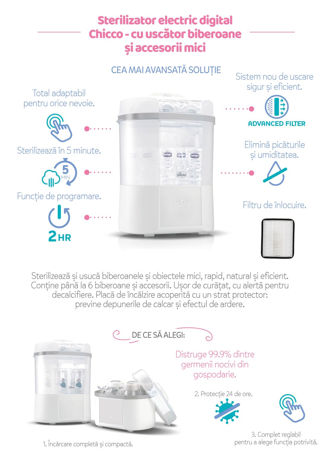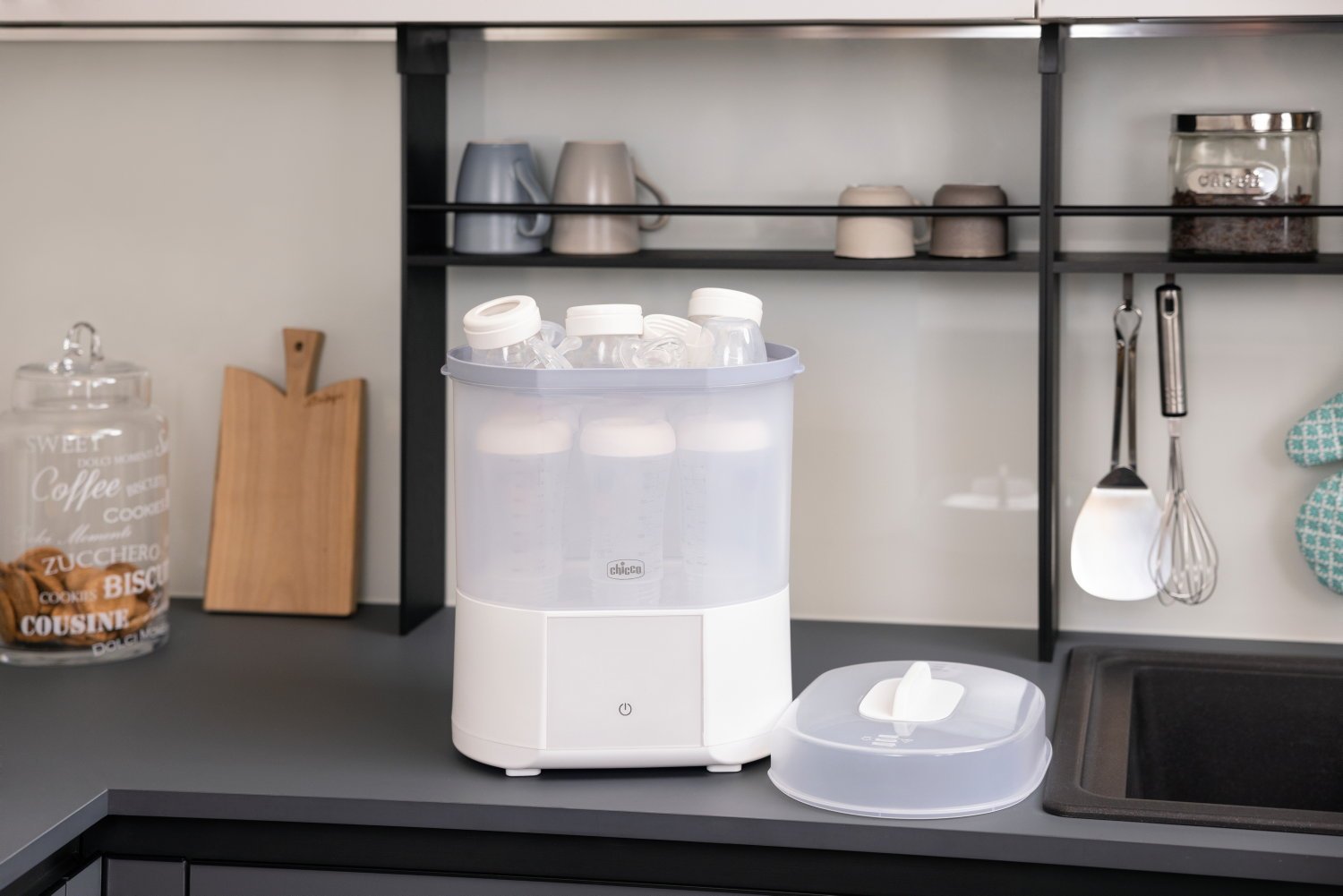 Cauți sterilizator biberoane? Alege un sterilizator biberoane cu uscare Chicco: cea mai avansată soluție pentru sterilizarea și uscarea biberoanelor și a accesoriilor mici pentru bebeluși!