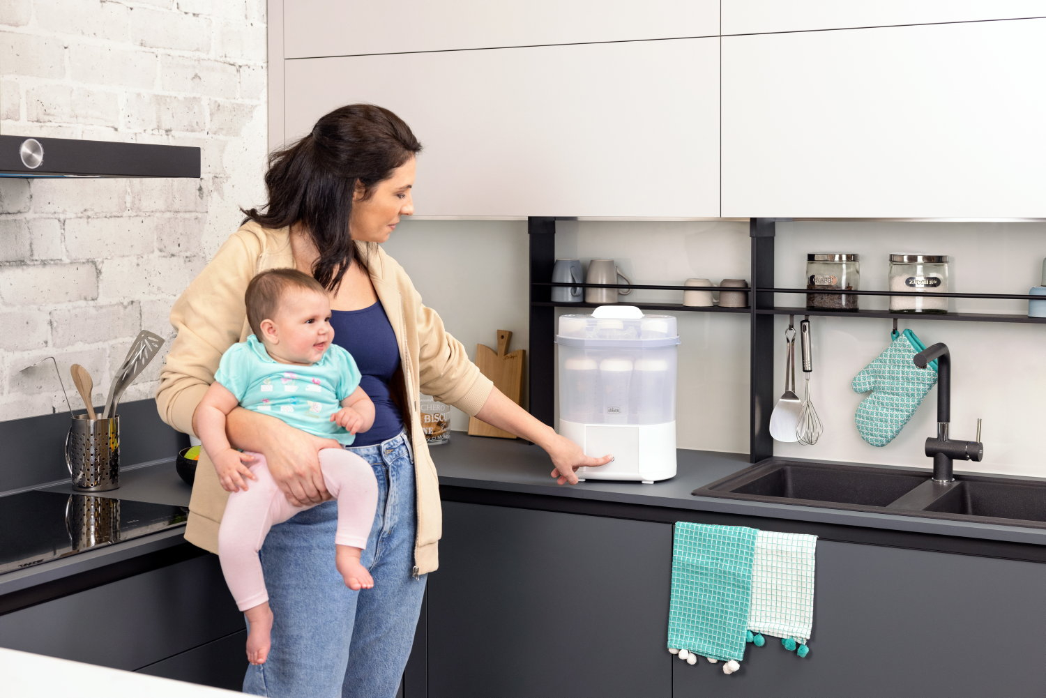 - sterilizează și usucă până la 6 biberoane și accesorii mici (tetine, suzete, lănțișoare pentru suzete) în mod rapid, în doar 5 minute după ce apa ajunge la punctul de fierbere, în mod natural și eficient.
