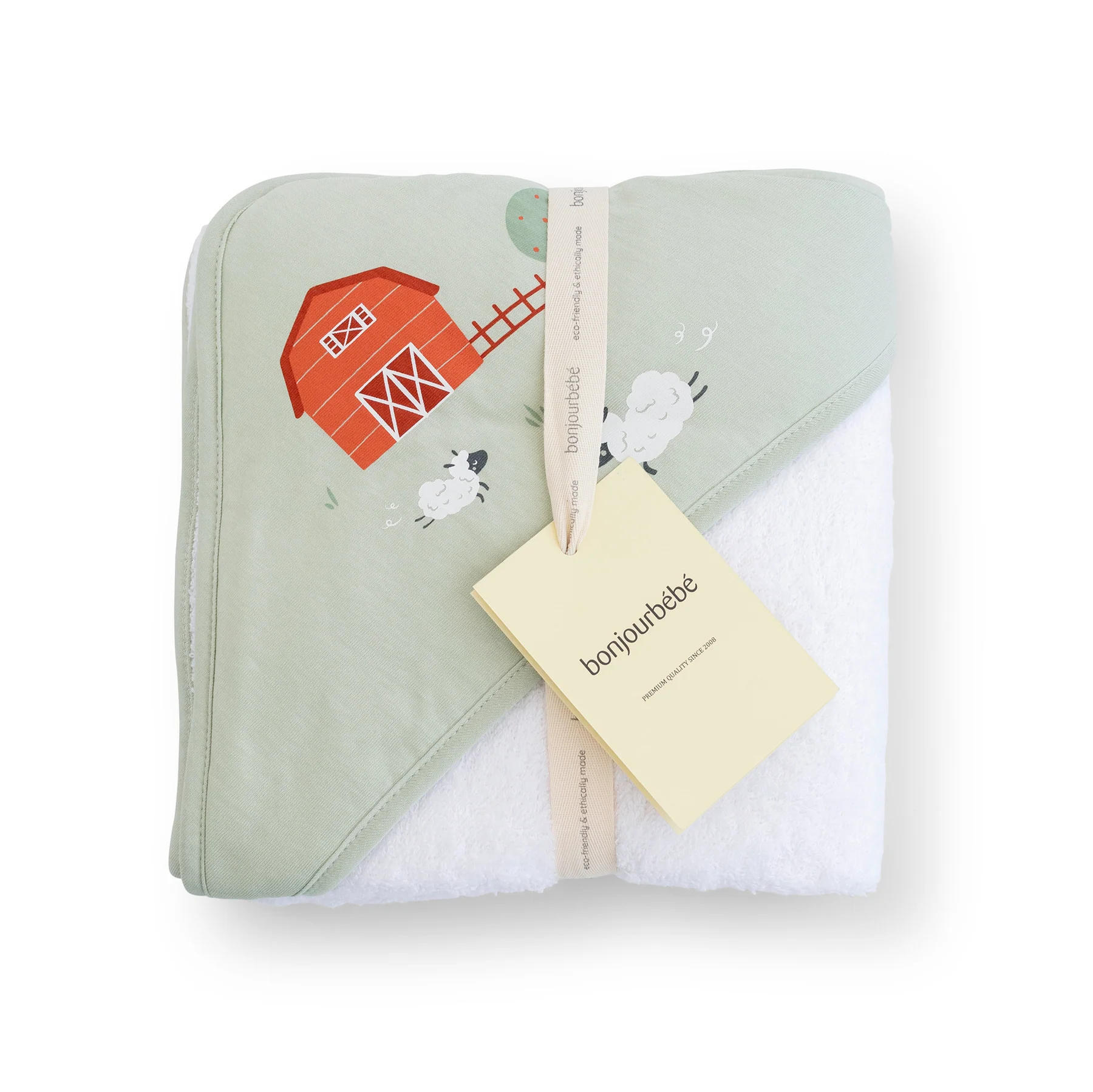 Bonjourbébé Prosop baie cu glugă bebeluși 0-5 ani – bumbac certificat OEKO-TEX®, 100x100 cm, Funny Farm