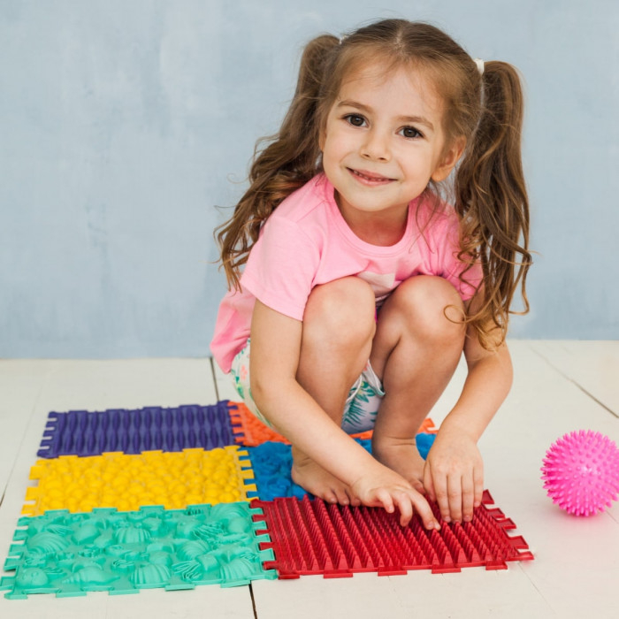 Covorașul ortopedic pentru masaj este alcătuit din 9 plăcuțe tip puzzle (26x26 cm fiecare), ușor de asamblat și combinat, ce oferă o experiență senzorială unică. Texturile variate – iarbă, prundiș, scoici, marin, lotusi și piramide– stimulează mușchii tălpilor și zonele reflexogene, ajutând la prevenirea și corectarea problemelor ortopedice.