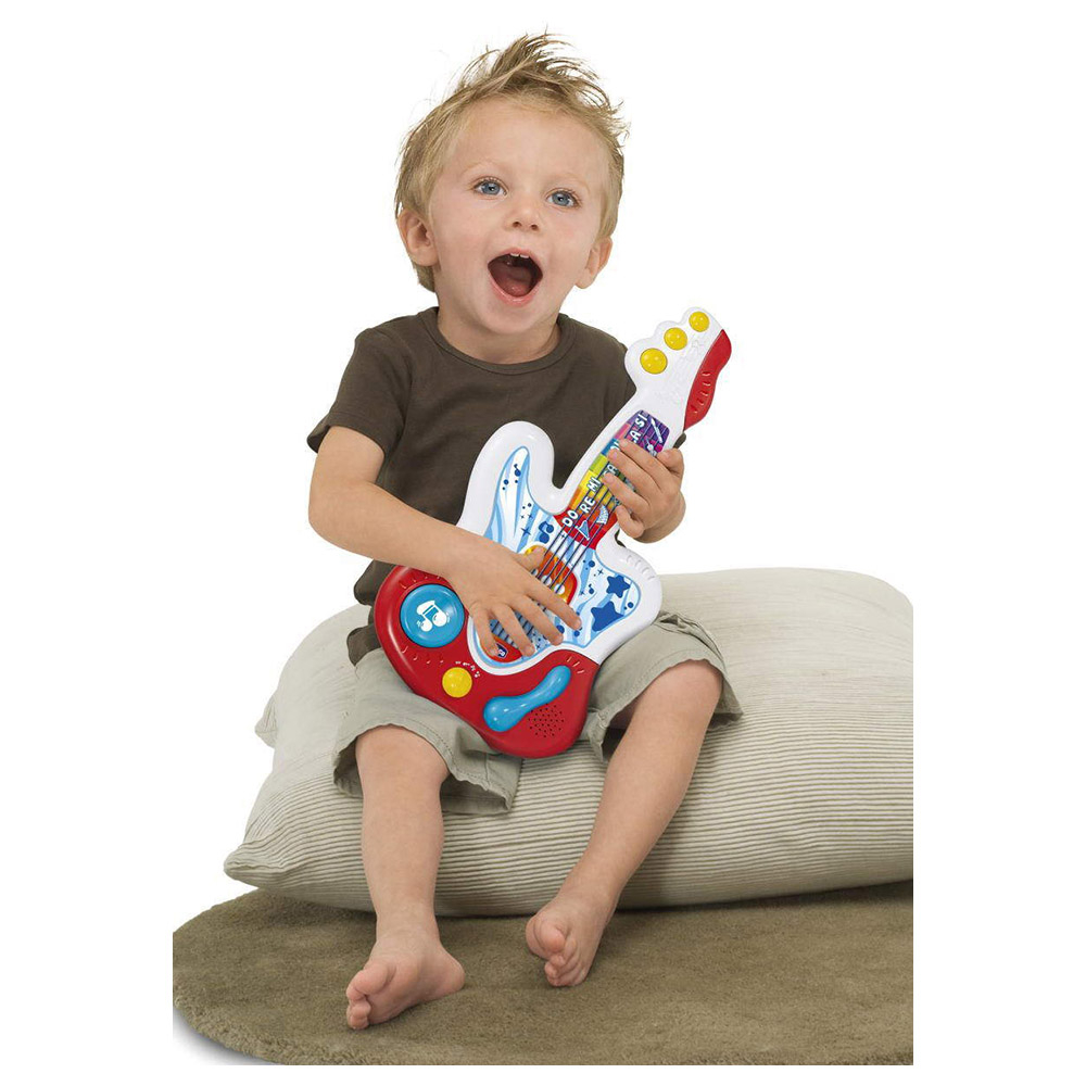 - Design atractiv – sub forma unei chitare electronice, jucăria captează atenţia copilului şi îl invită la explorare şi joacă activă.