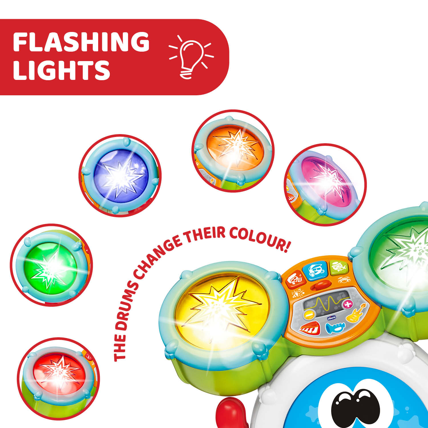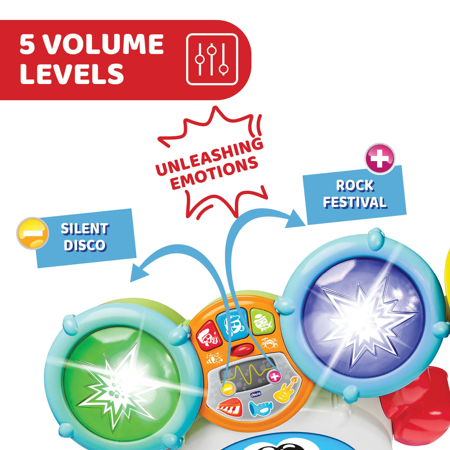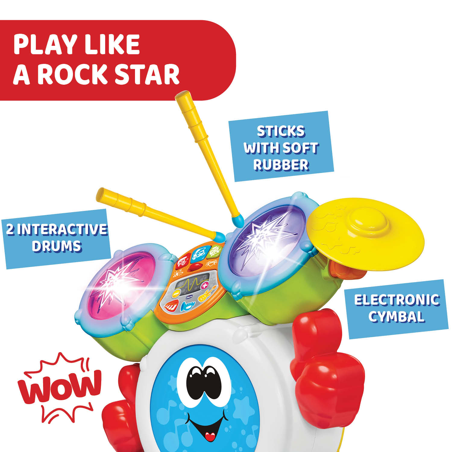 Chicco Rocky the Drum este o jucarie ideala pentru copiii pasionati de muzica si sunete, oferind o experienta de invatare distractiva si captivanta. Cu efecte luminoase, sunete diverse si moduri interactive de joaca, aceasta toba electronica transforma fiecare moment de joaca intr-o adevarata aventura muzicala!