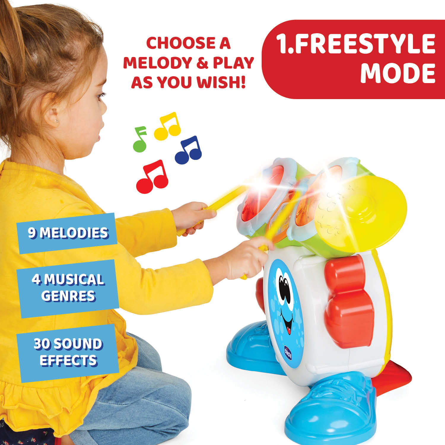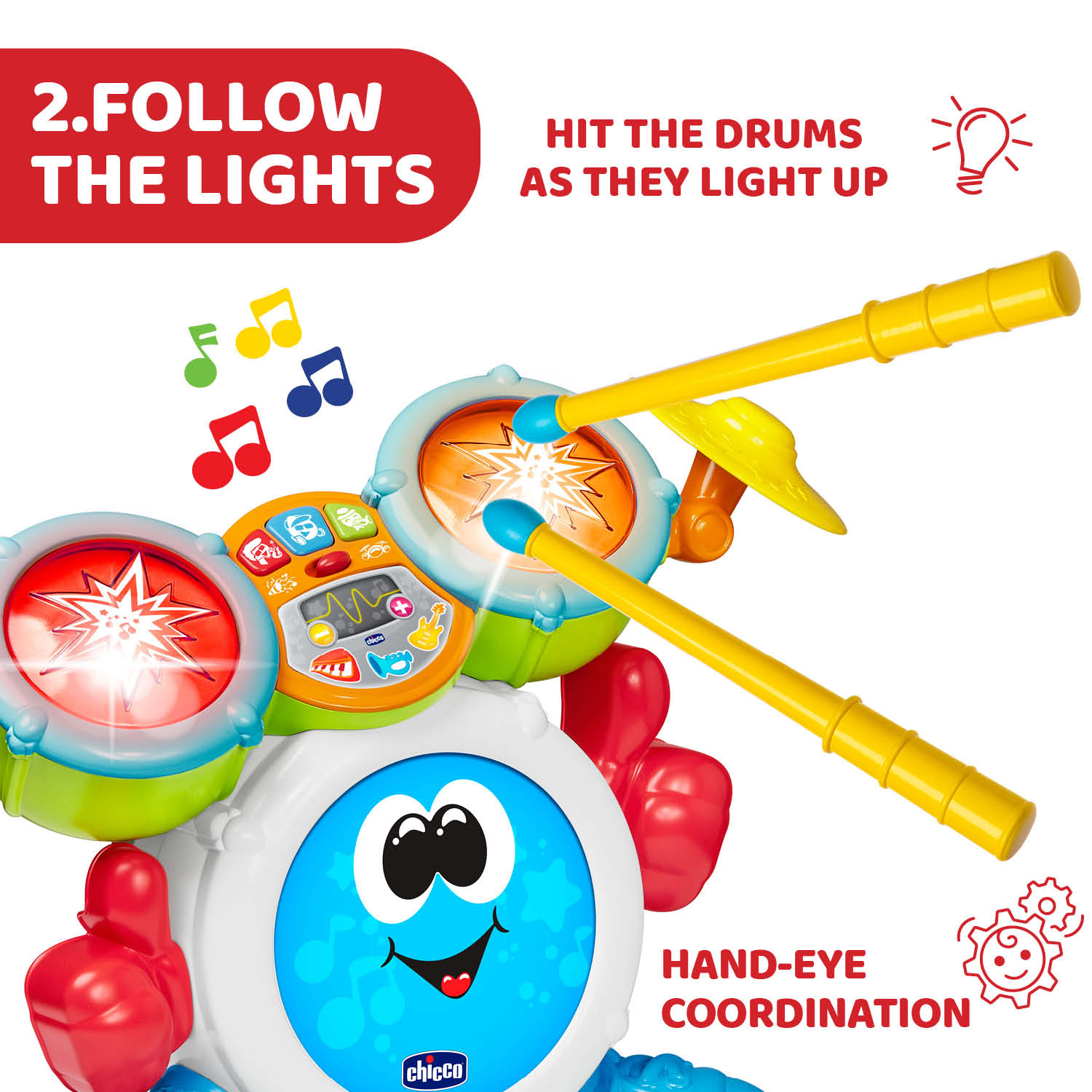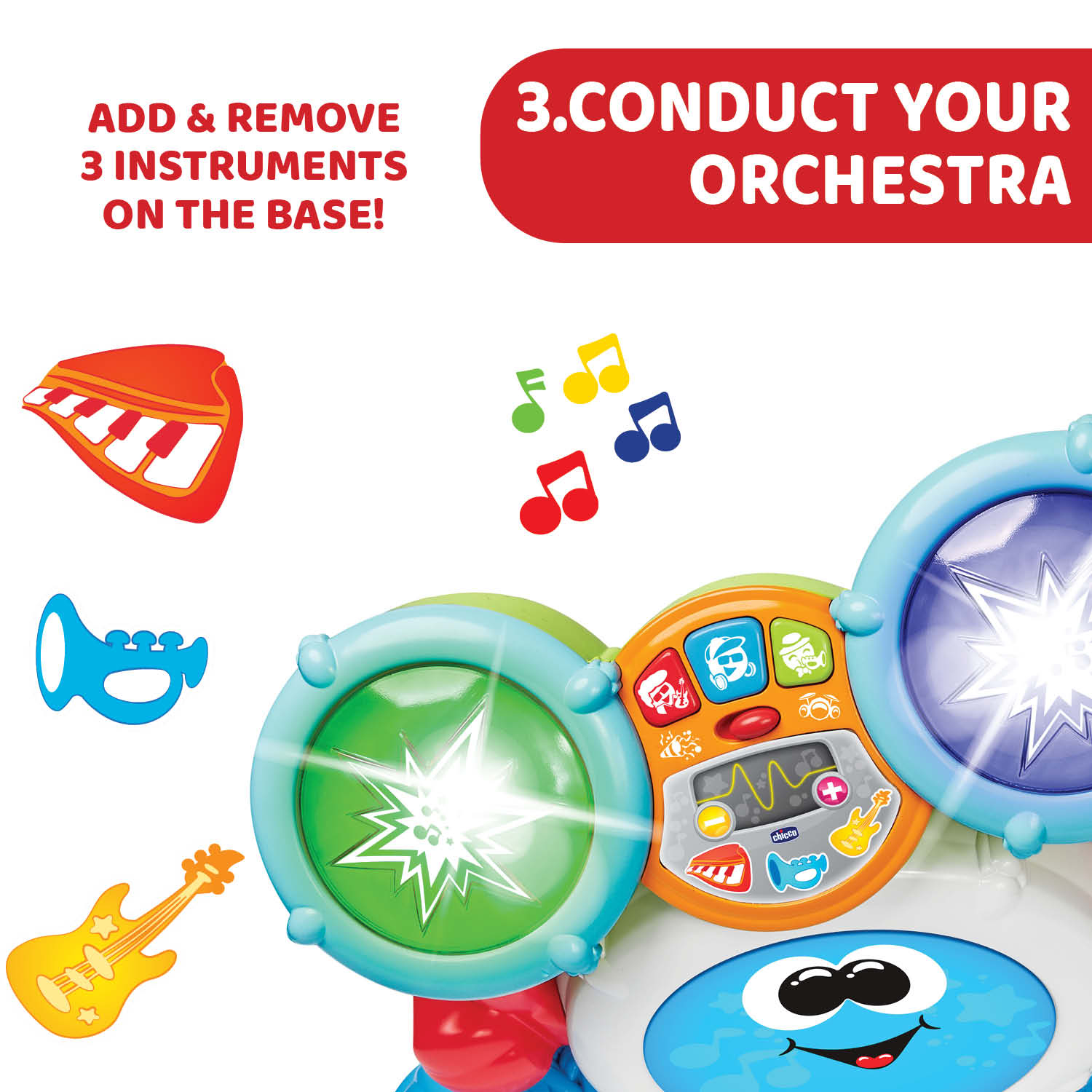 Chicco Rocky the Drum este o jucarie ideala pentru copiii pasionati de muzica si sunete, oferind o experienta de invatare distractiva si captivanta. Cu efecte luminoase, sunete diverse si moduri interactive de joaca, aceasta toba electronica transforma fiecare moment de joaca intr-o adevarata aventura muzicala!