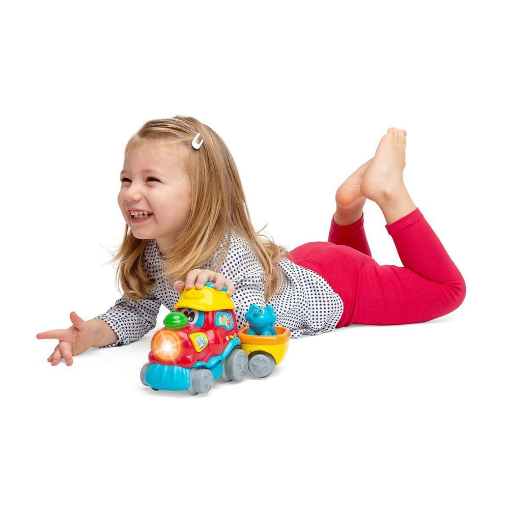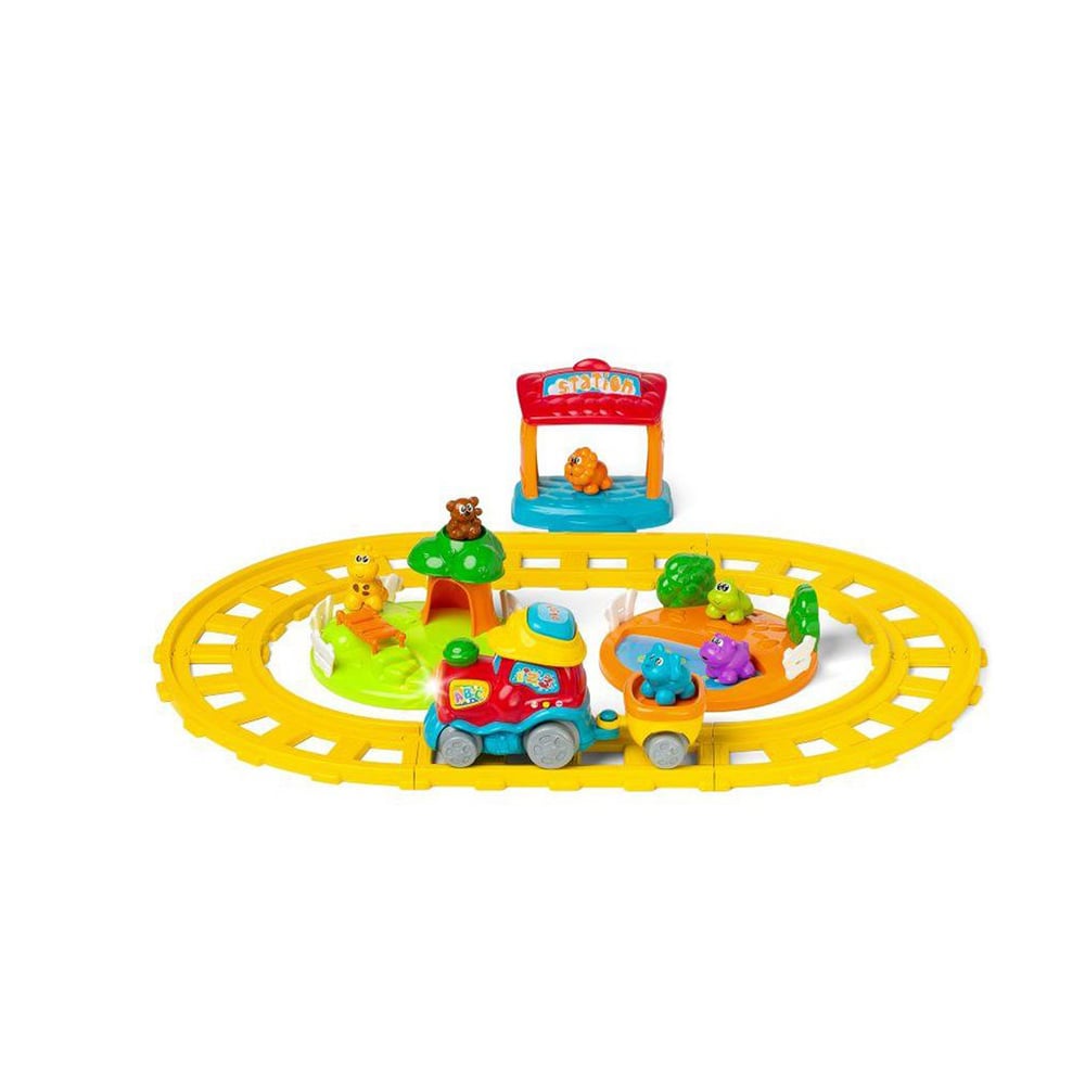 Trenul electric face turul sinei cu sunete reale si cantece care-l invata pe copil despre cele 6 animale si il distreaza