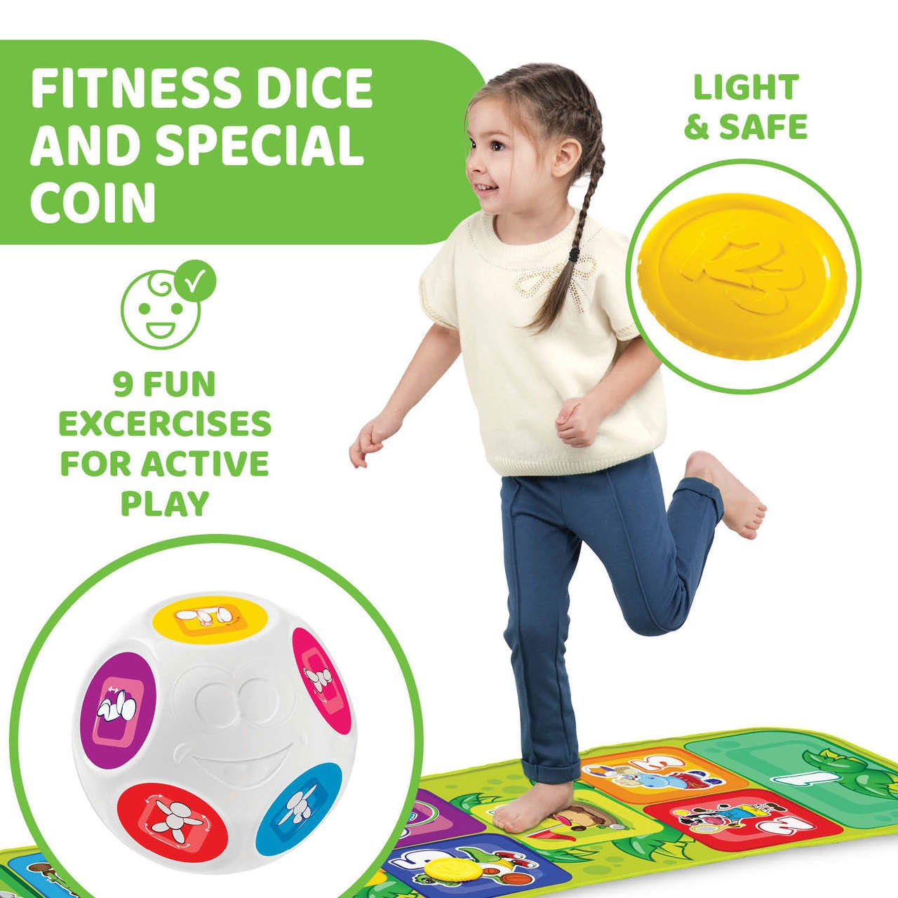 Jump & Fit Playmat include și două tipuri de jocuri captivante, menite să stimuleze atât coordonarea, cât și atenția copilului: