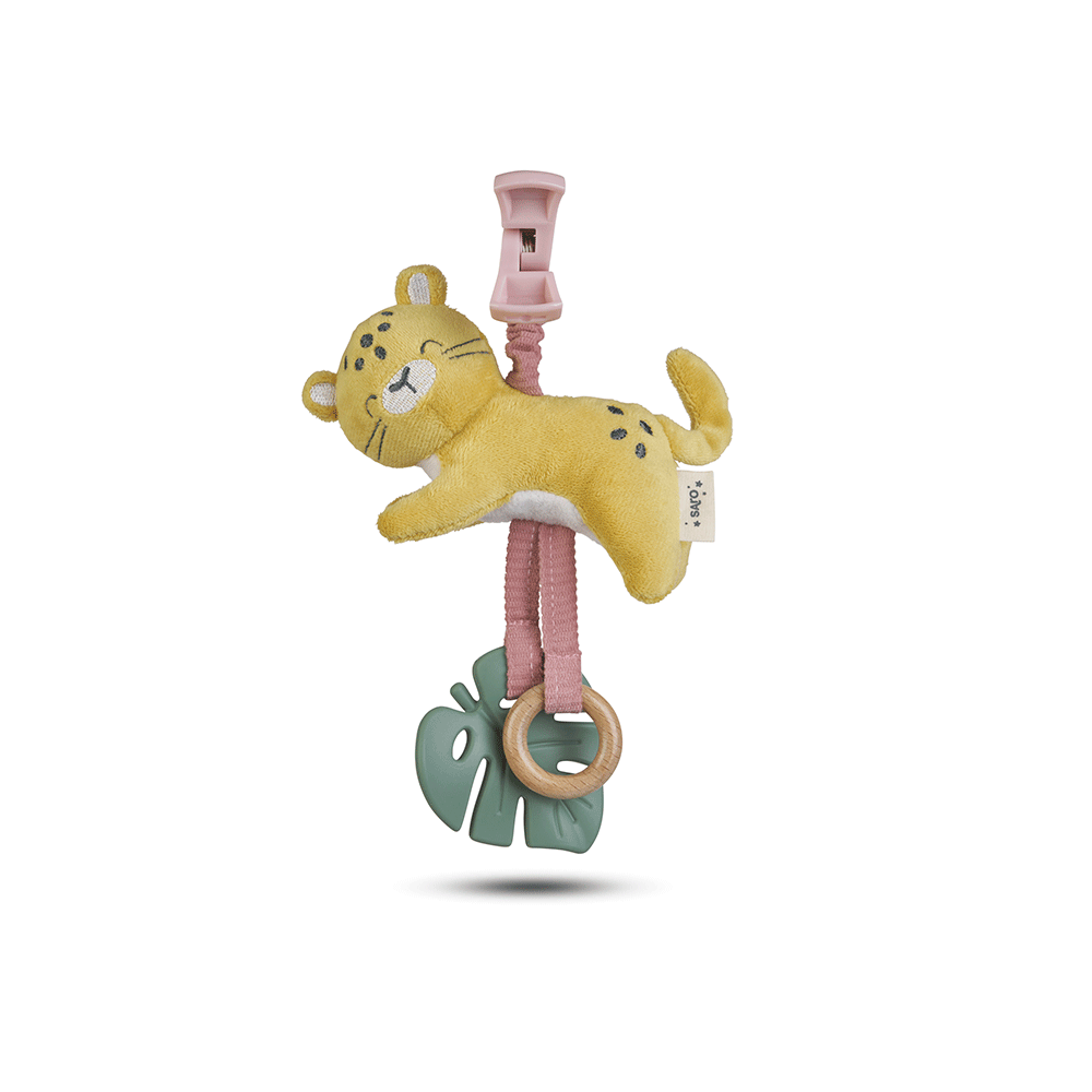 Are o jucărie moale din pluș cu un clopoțel, un theeter din silicon premium gata să calmeze dentiția și un inel din lemn. În plus, cu clema sa, îl poate însoți pe micuțul dvs. în pătuț, în cărucior sau în parc.