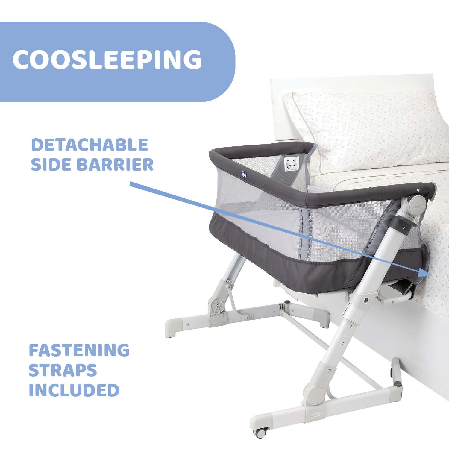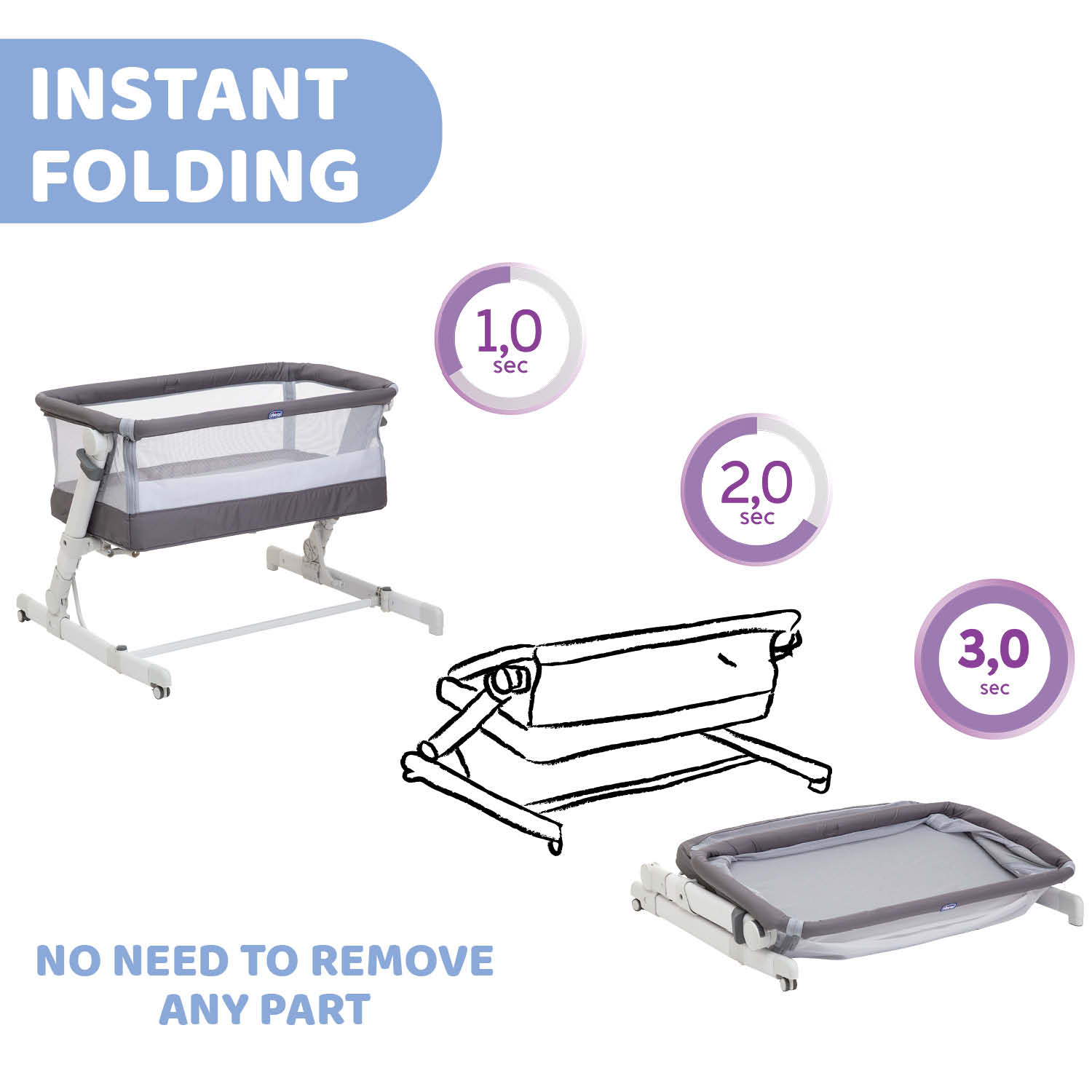 Chicco Next2Me Pop Up este un co-sleeper confortabil pentru bebeluși și părinți deopotrivă. Barierea protectoare este detașabilă și astfel, atunci când pătuțul bebe este atașat de patul părinților, îți va fi foarte ușor să răsfeți,să liniștești sau să-ții hrănești bebelușul în timpul nopții.Datorită picioarelor pliabile, pătuțul poate fi poziționat foarte aproape de patul părinților și securizat cu centurile din dotare.