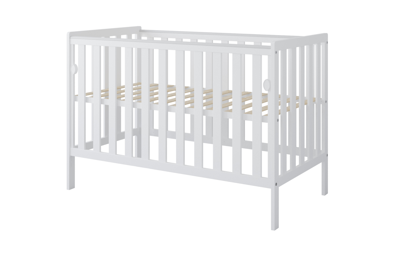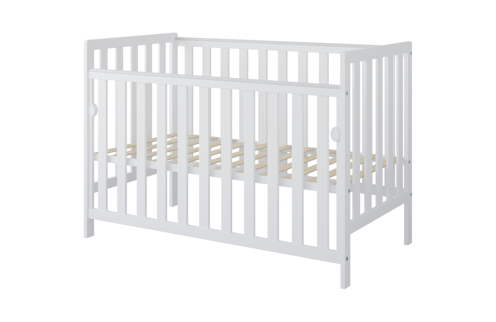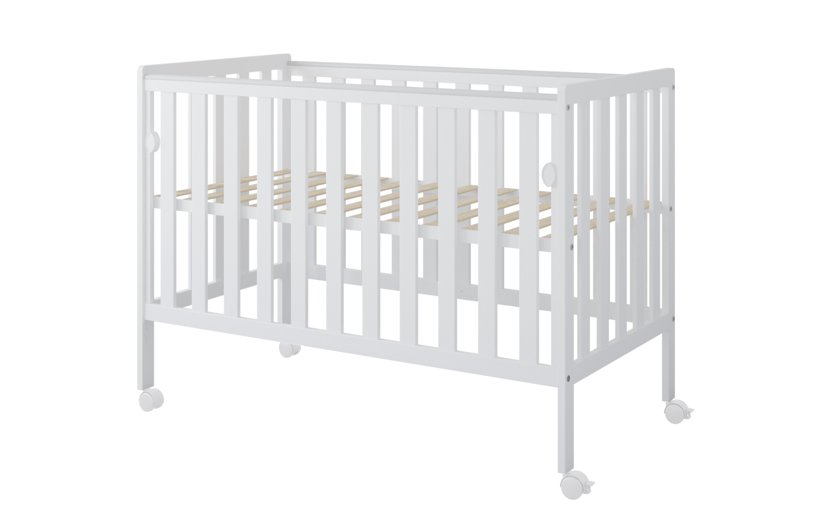 Pătuț din Lemn BAMBI Alb 120×60 cm Laterala culisantă · Roți cu blocare · Protecție silicon pentru dentiție · EN 716-1