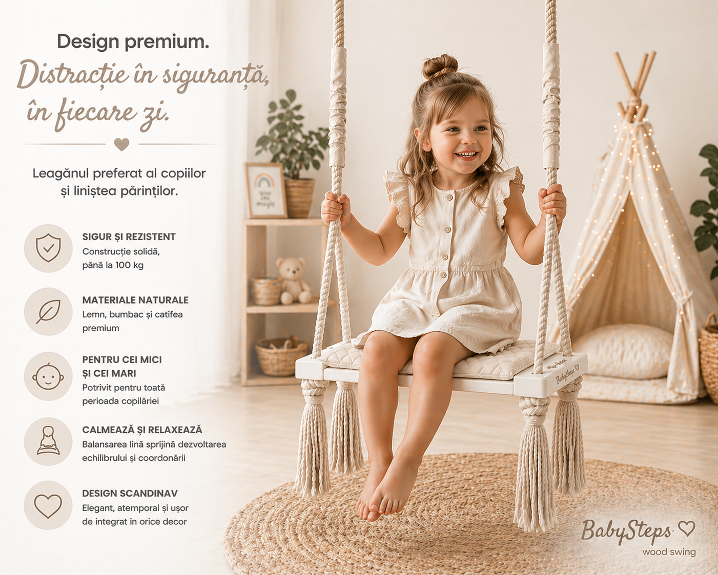 Leagănul BabySteps WoodSwing nu este doar un accesoriu de joacă, ci un spațiu dedicat relaxării și dezvoltării copilului tău.