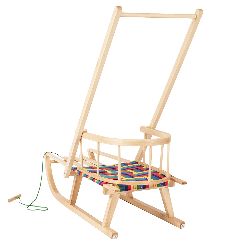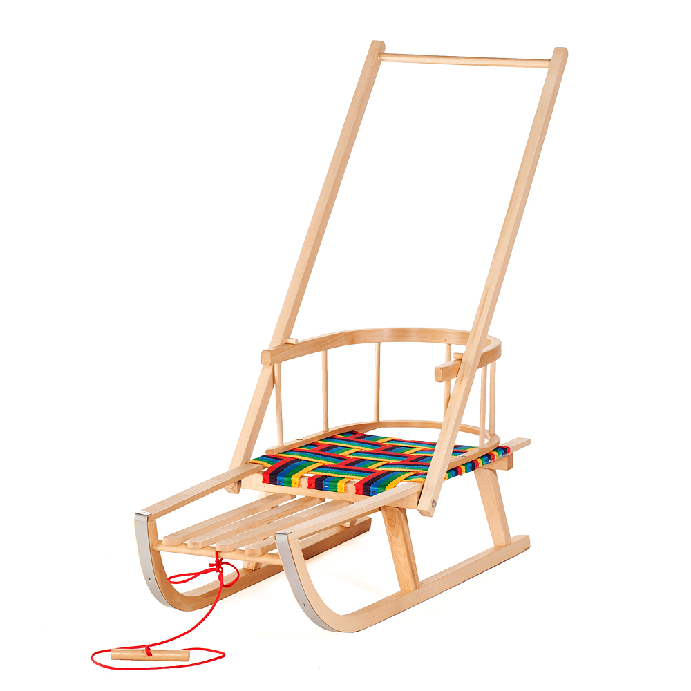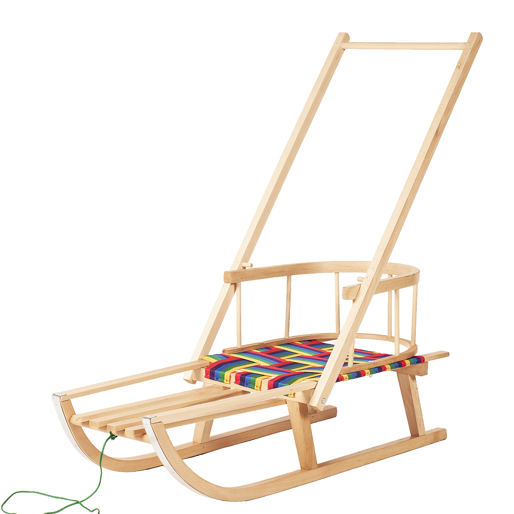 Sanie Ultimate Plus din lemn cu spătar, șezut textil și împingător – model premium pentru copii | Sanie fag cu mâner și cablu de tras